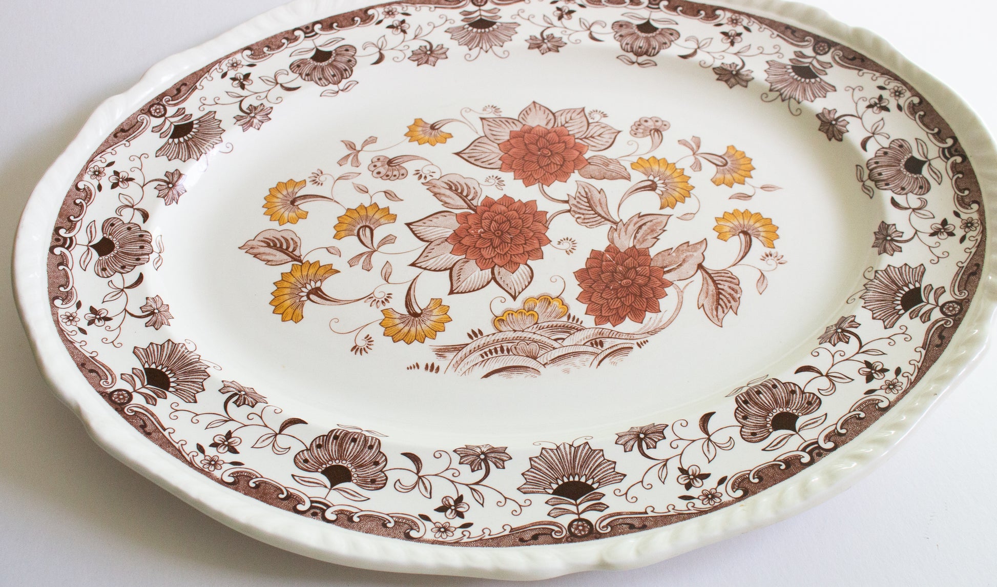 A vintage Adams 'Cornwall' pattern brown and white transferware platter. In very good condition, light wear. Approx. 43 x 34 cm. Interested overseas buyers please enquire re: shipping option in the first instance as item weighs in excess of 2 kg.