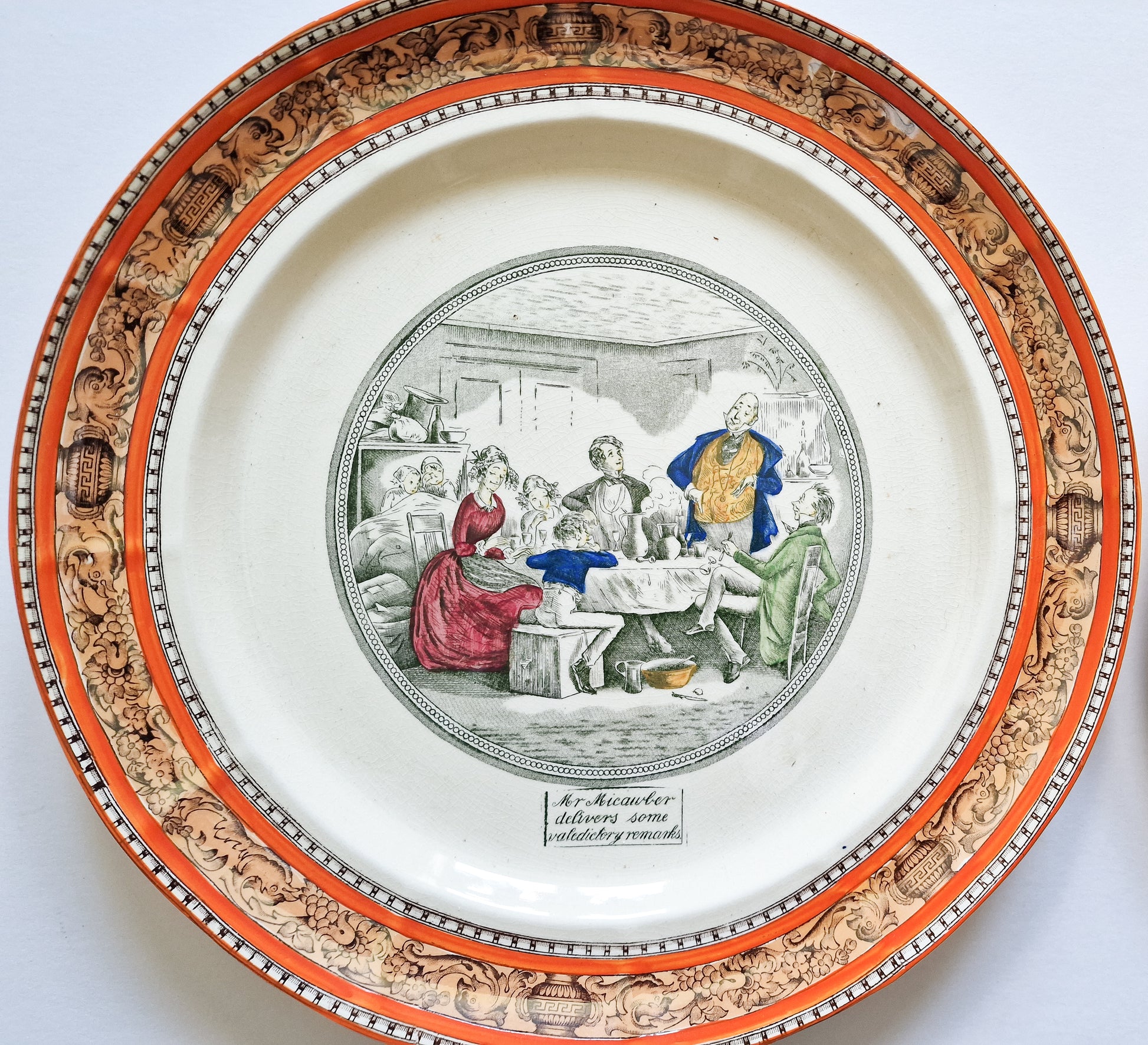 A pair of large Adams Charles Dickens collector's plates: 'Mr. Micawber delivers some valedictory remarks', and 'Mr. Pickwick addresses the Club'. In good condition, crazing evident, designed to hang on the wall. Approx. 32 cm in diameter. Interested overseas buyers please enquire re: shipping options in the first instance as item weighs in excess of 2 kg with packaging.