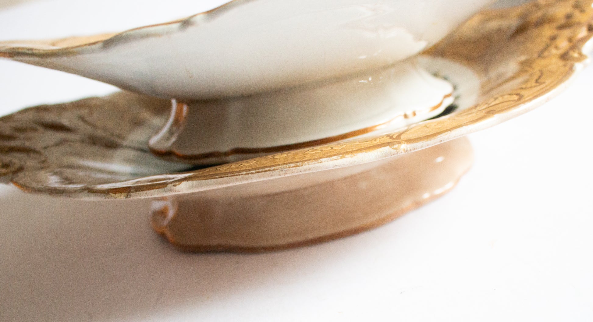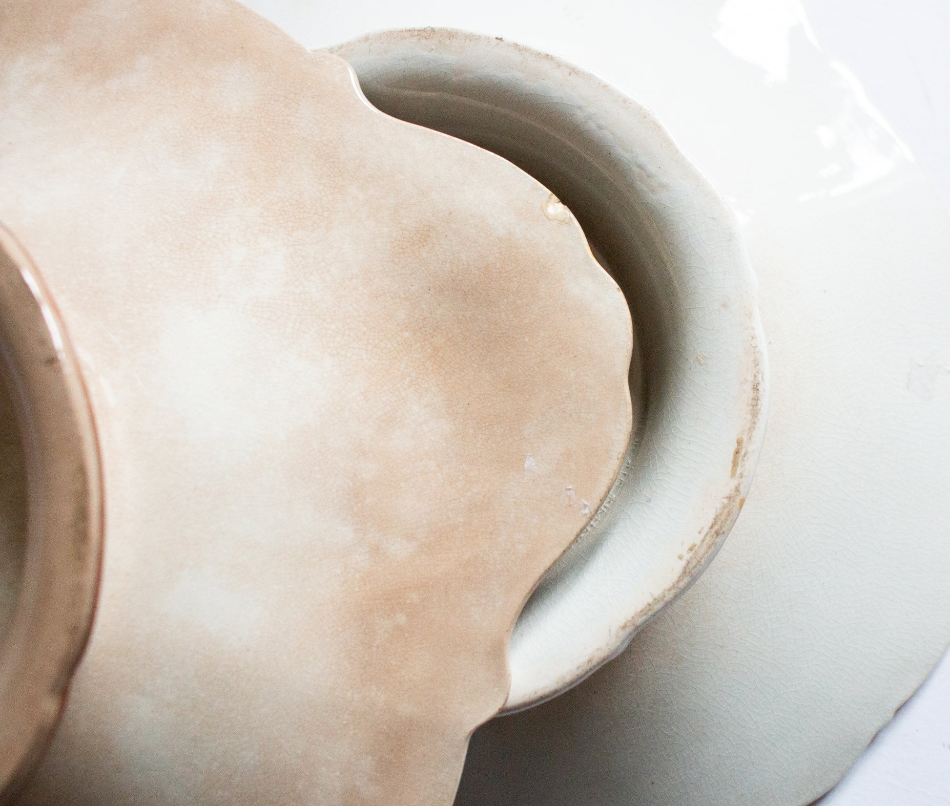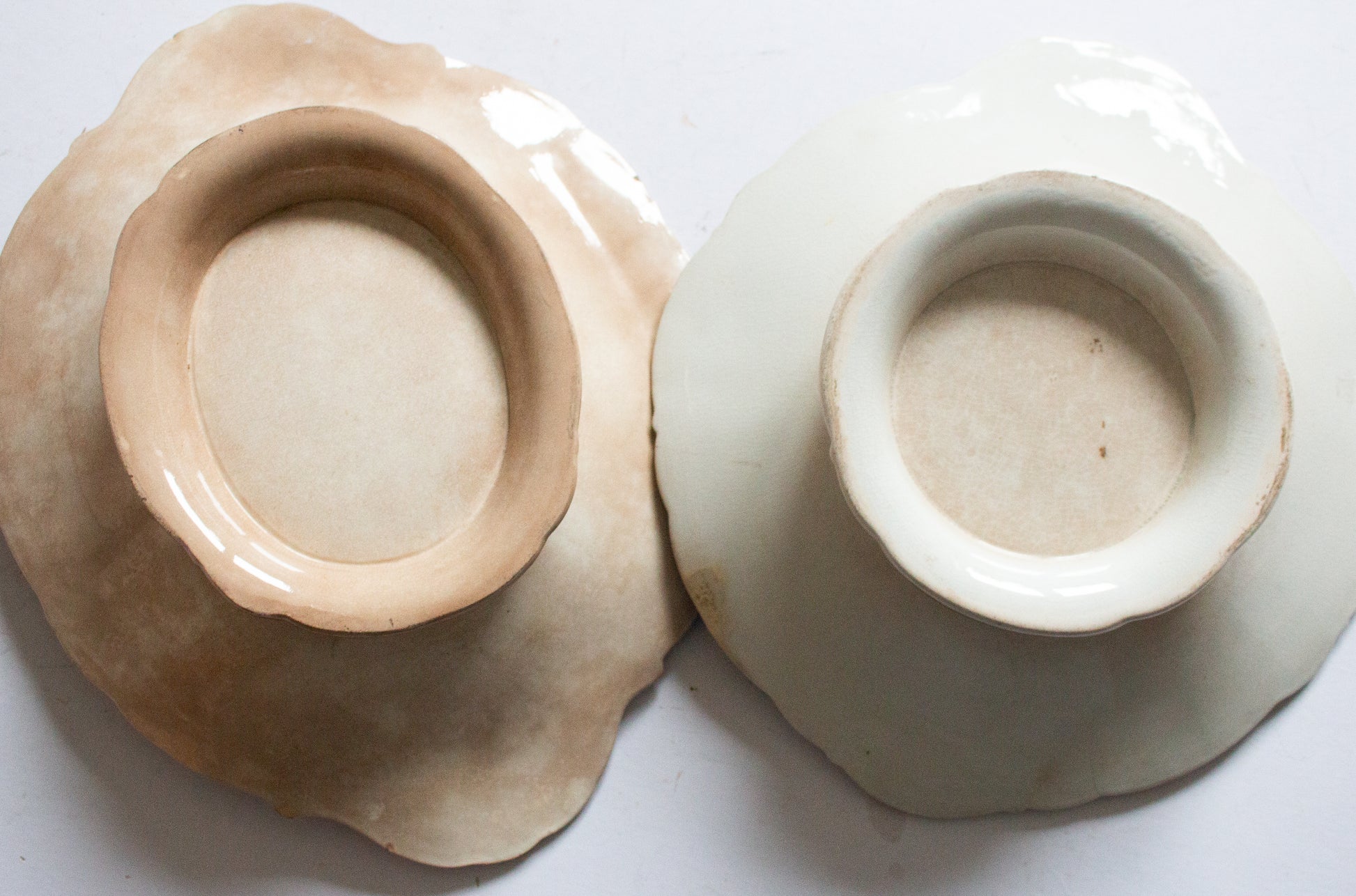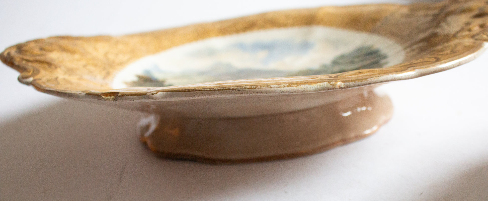 A pair of nineteenth century comports with central pastoral landscape detail, probably continental. In fair condition only, crazing and staining evident. Of slightly different shapes, they approx. 25 cm across, the comport has a height of approx. 6 cm. Interested overseas buyers please enquire re: shipping details in the first instance as item weighs in excess of 2 kg with packaging.