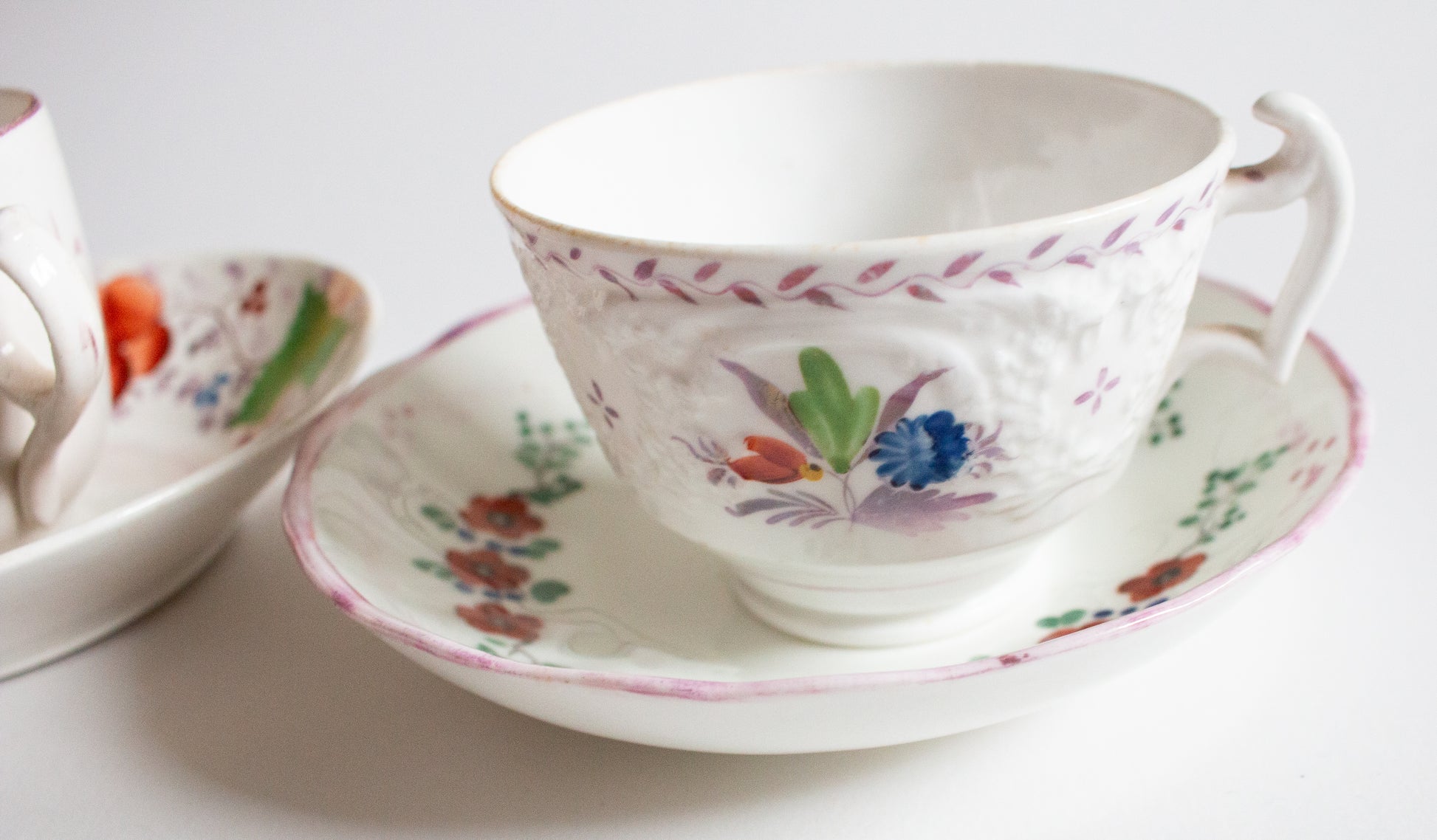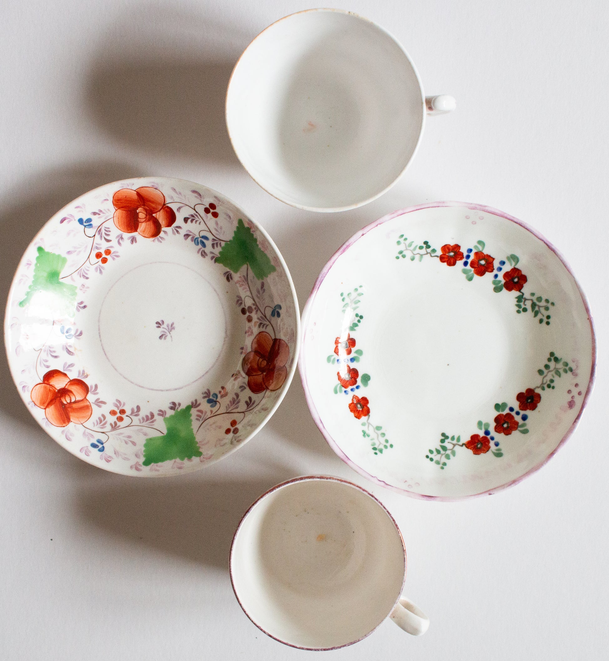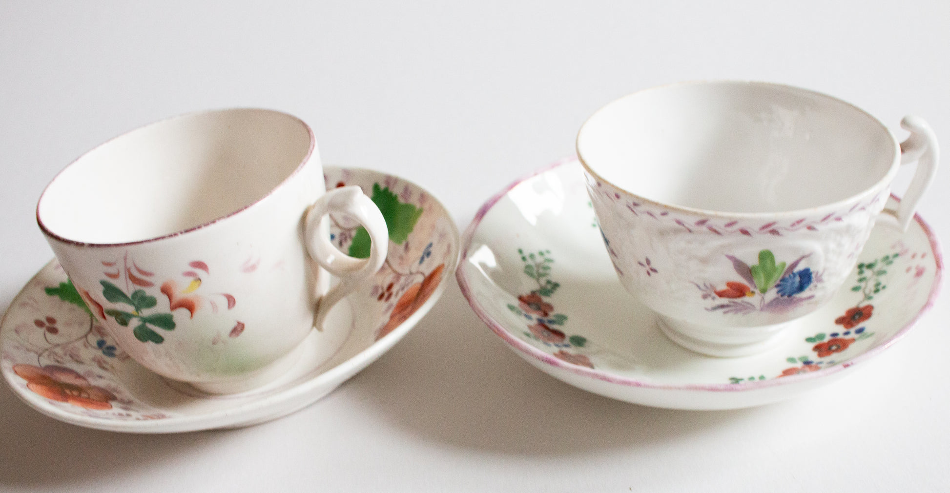 A pair of mid to late nineteenth century mismatched teacups and saucers. In good condition, some wear evident. The teacups are approx. 6 cm tall, the saucers approx. 14.5 cm across.