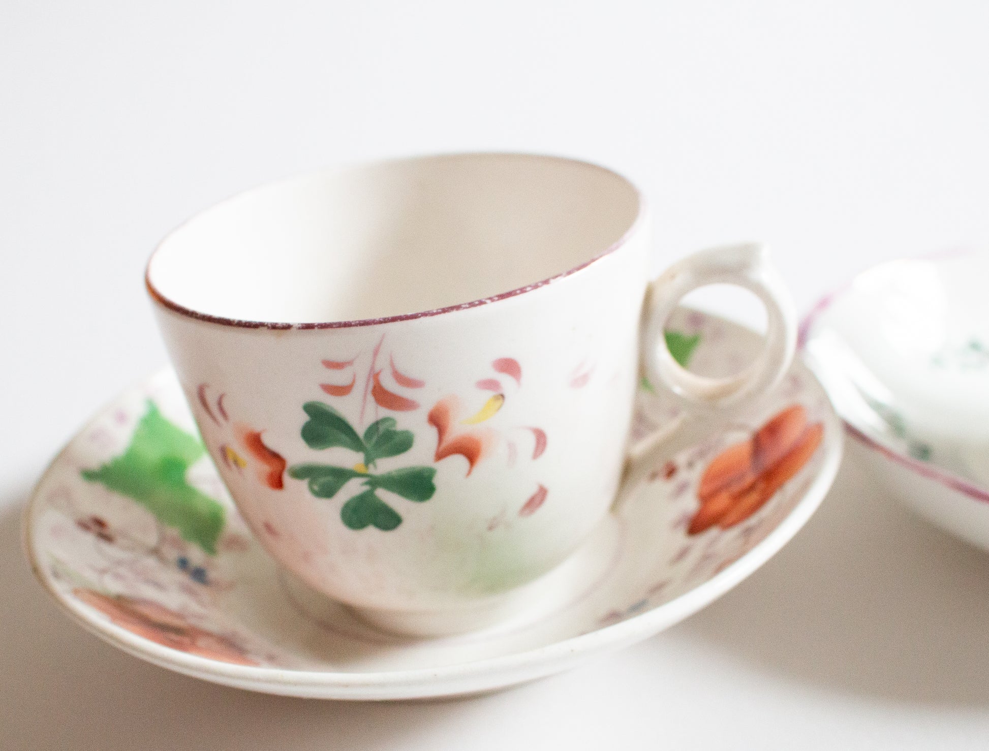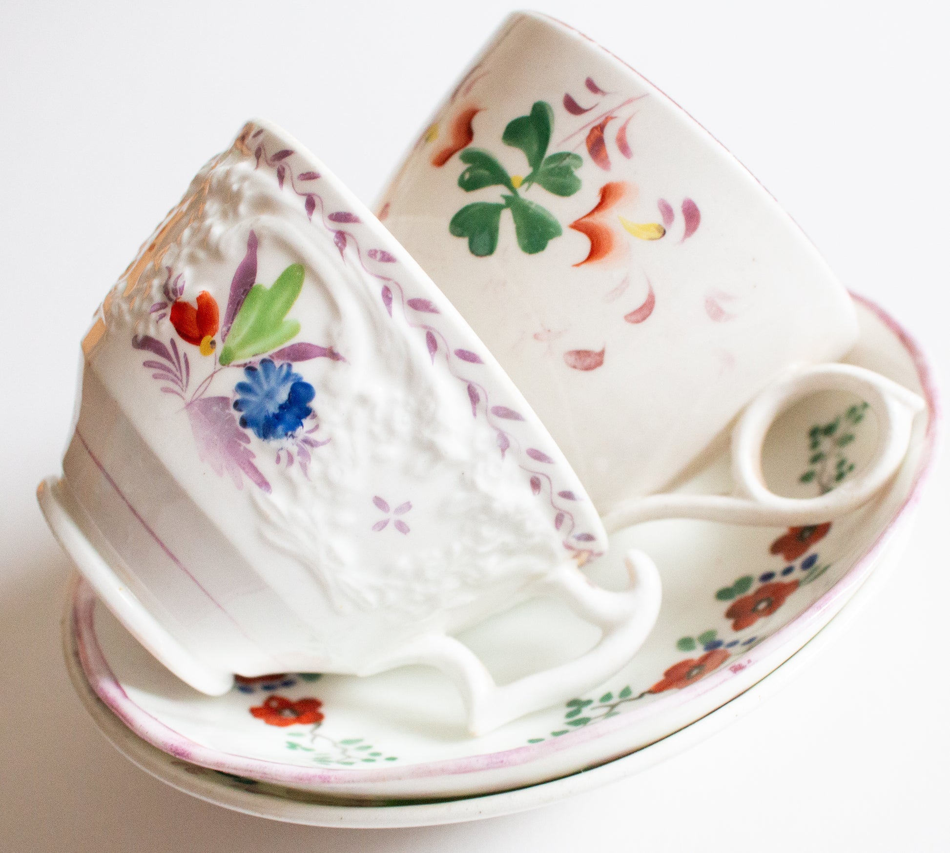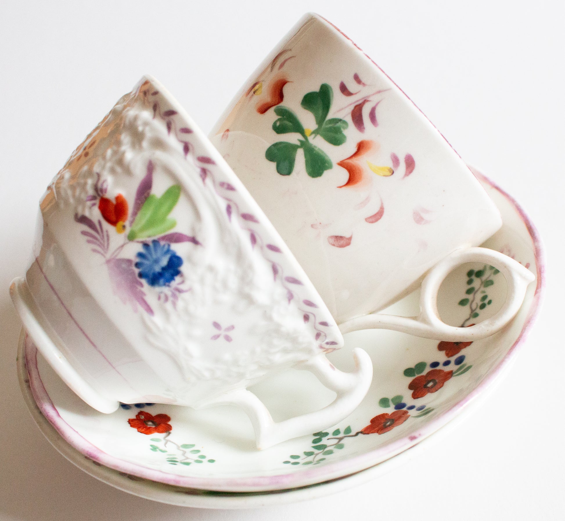 A pair of mid to late nineteenth century mismatched teacups and saucers. In good condition, some wear evident. The teacups are approx. 6 cm tall, the saucers approx. 14.5 cm across.