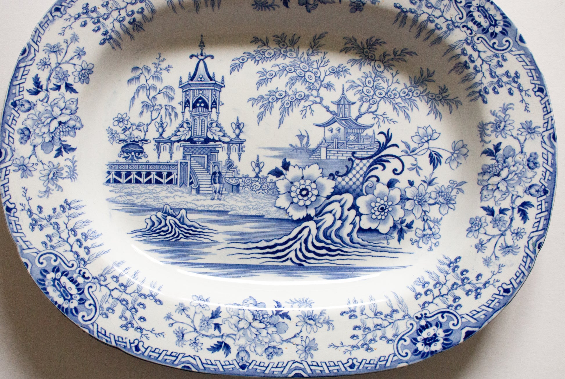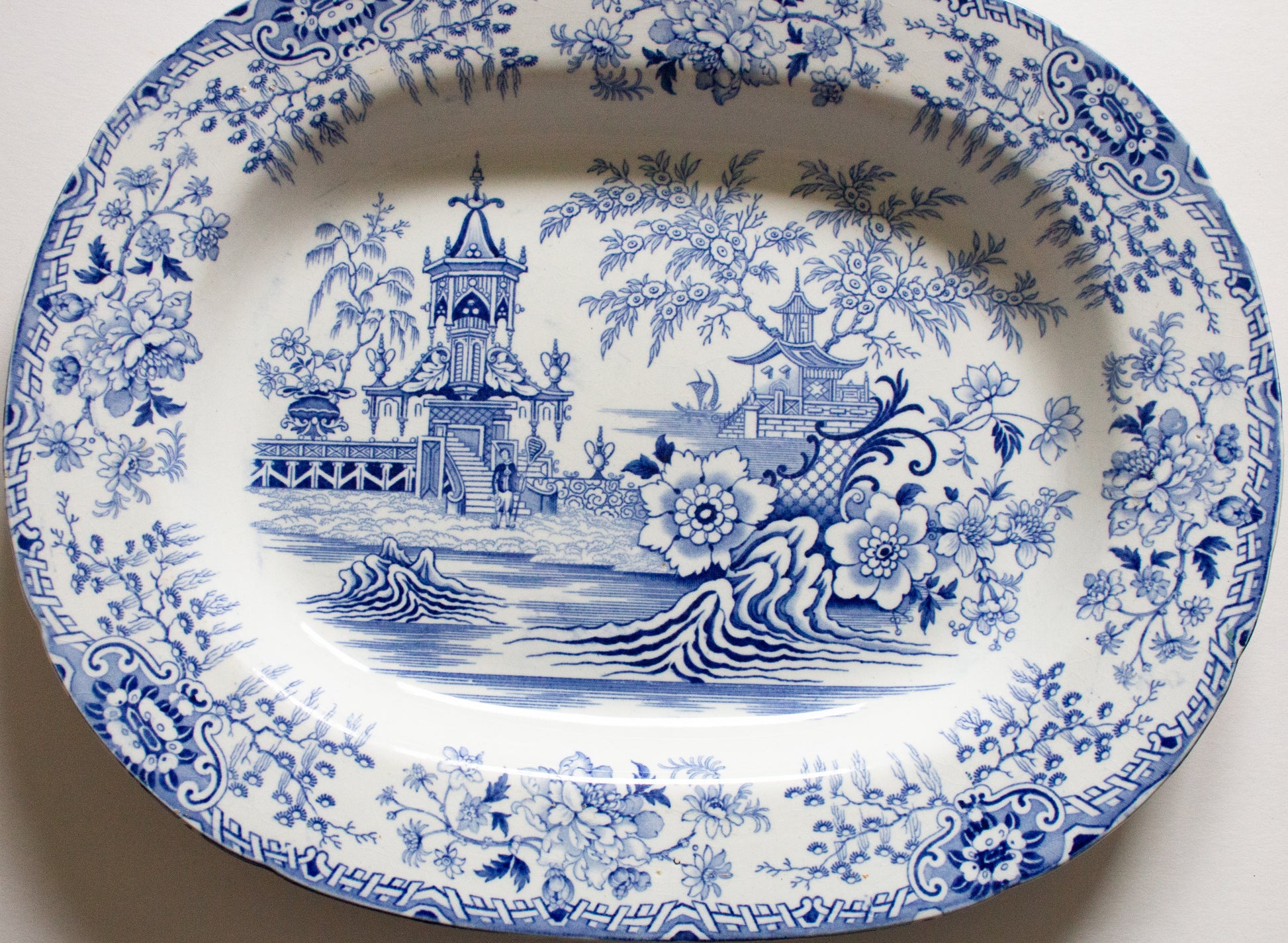 Antique Pagoda Pattern 18" Blue and White Transferware Meat Platter