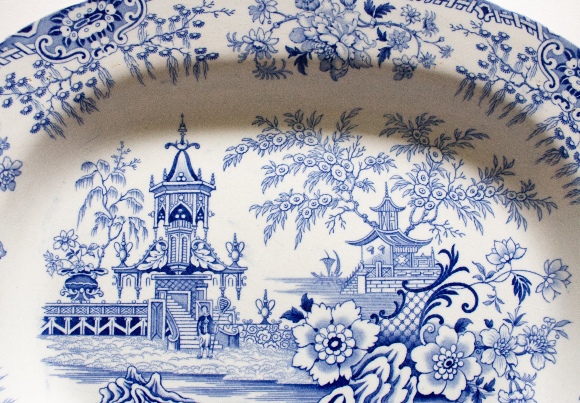An early twentieth century pagoda pattern blue and white transferware platter. In good condition, some light wear evident. Approx. 46 x 37 cm. Stamped to base but not legible. Interested overseas buyers please enquire re: shipping option in the first instance as item weighs in excess of 2 kg.