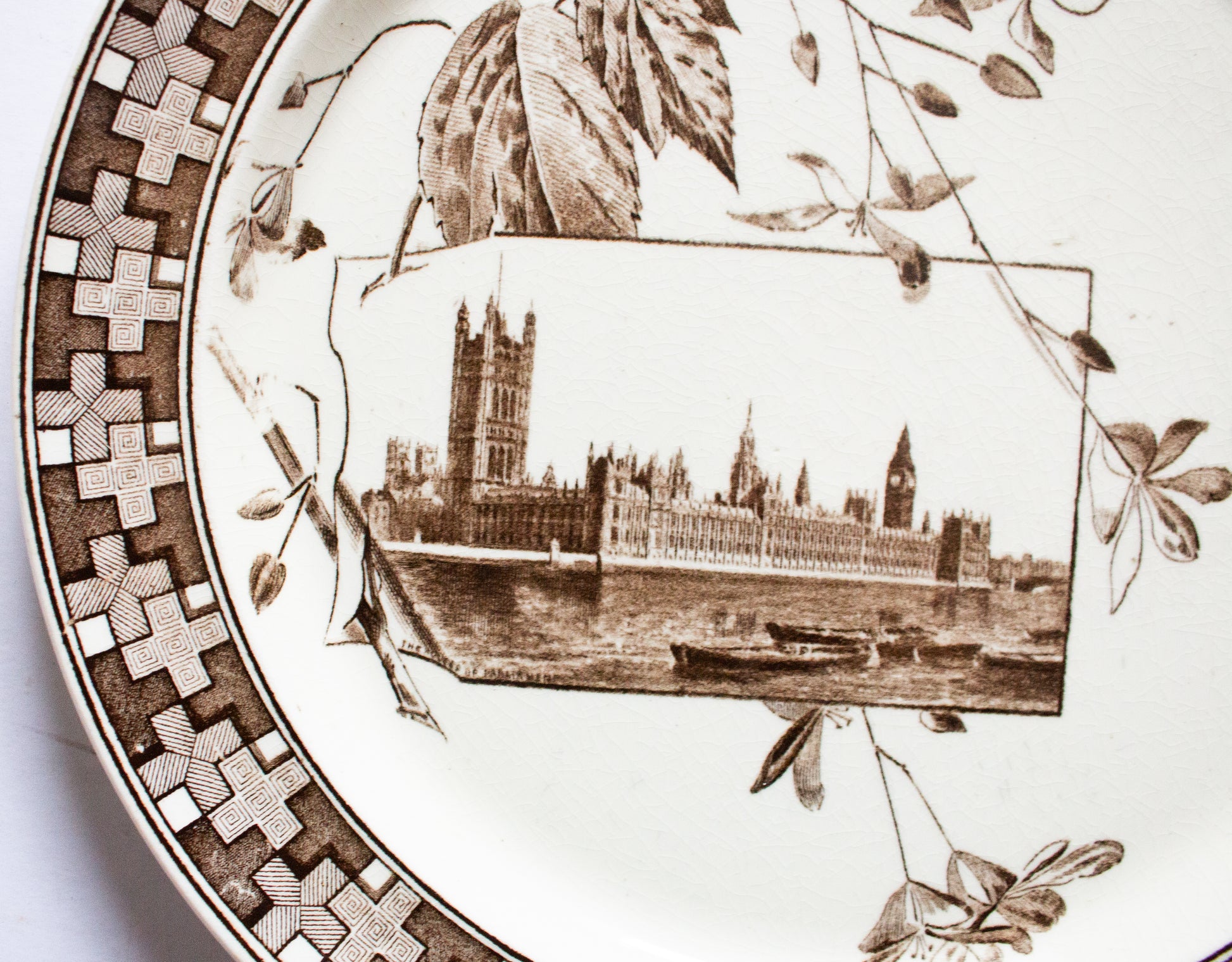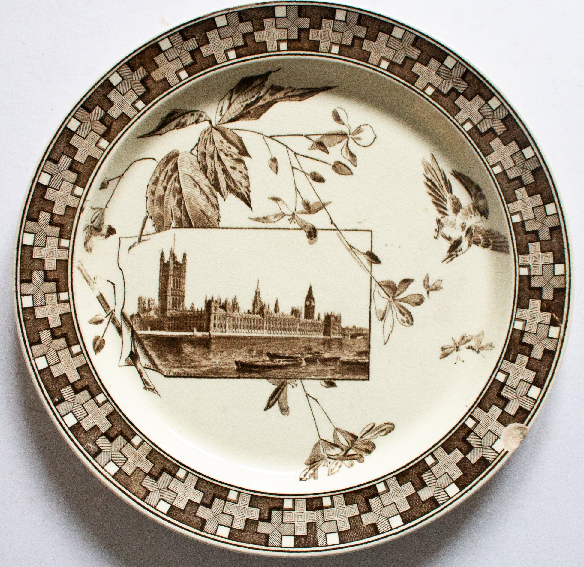 A Powell, Bishop & Stonier 'London' pattern brown and white transferware plate with detail of the Houses of Parliament, dated 1882. In fair condition only, crazing and evidentchip to rim on front. Approx. 25.5 cm across.