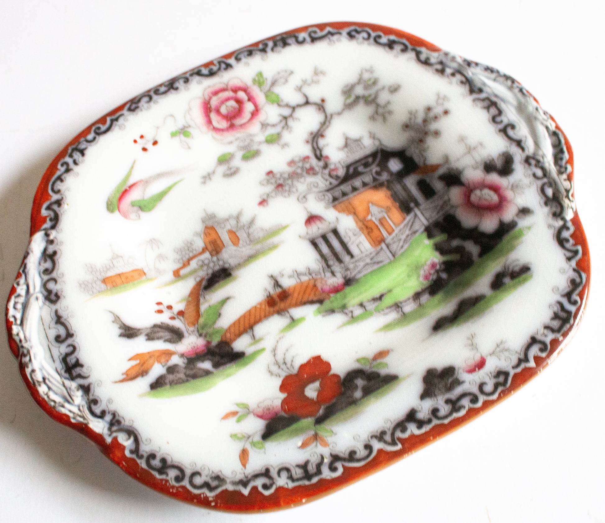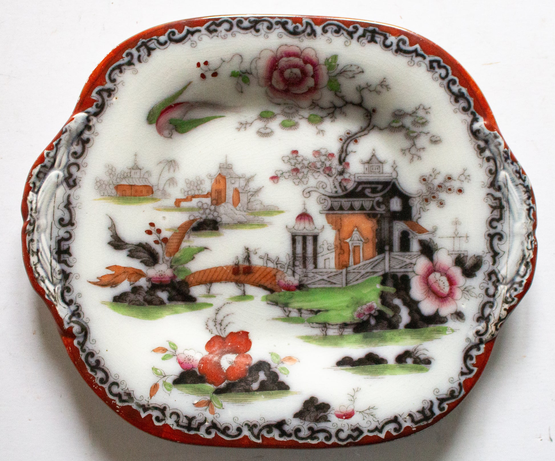 A mid to late nineteenth century Rathbone & Co. chinoiserie pattern plate with moulded handles. In good condition, crazing evident, occasional rubbing to edges and pattern. Approx. 23 cm square. Decorator's mark to base.