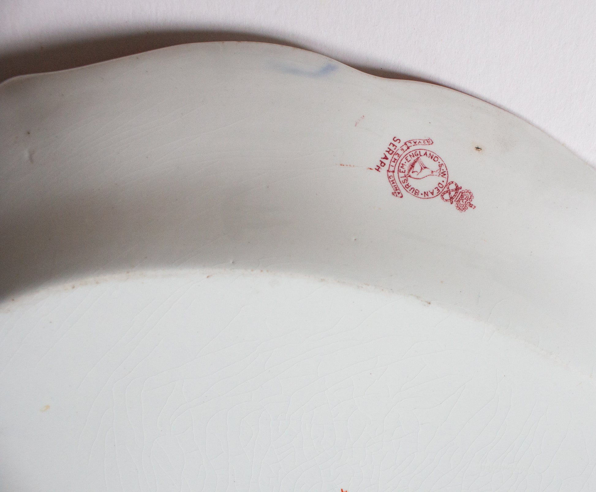 An early twentieth century Staffordshire S. W. Dean Burslem 'Seraph' pattern red and blue transferware platter. In good condition, some light use evident. Approx. 41 x 31 cm. Interested overseas buyers please enquire re: shipping option in the first instance as item weighs in excess of 2 kg.