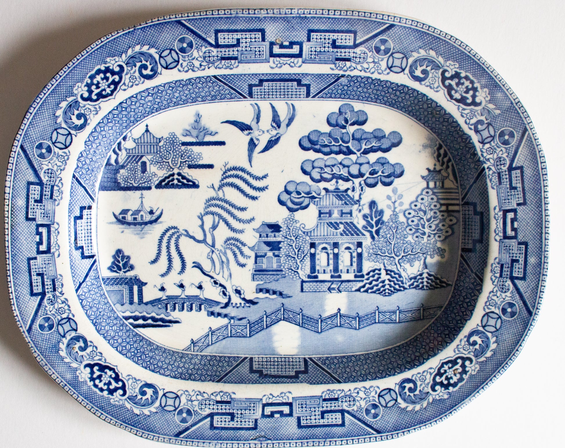 A late nineteenth century or early twentieth century blue and white transferware 'Willow' pattern platter. In good condition, crazing and staining evident. Approx. 34 x 27 cm.