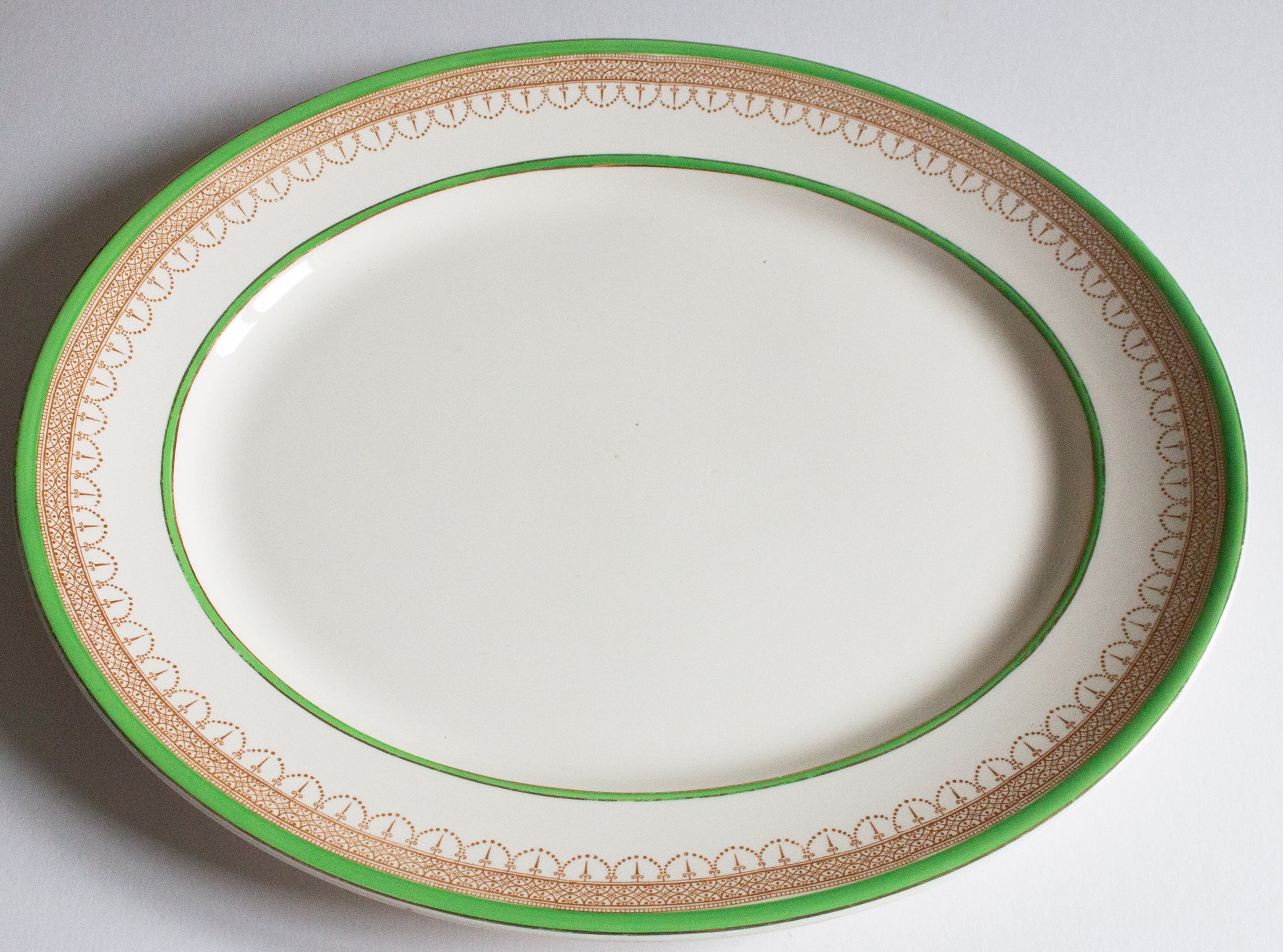 A mid twentieth century Burgess & Leigh Burleigh Ware green and gold serving platter. In good condition, some light wear. Approx. 38 x 33 cm. Stamped to base. Interested overseas buyers please enquire re: shipping option in the first instance as item weighs in excess of 2 kg.