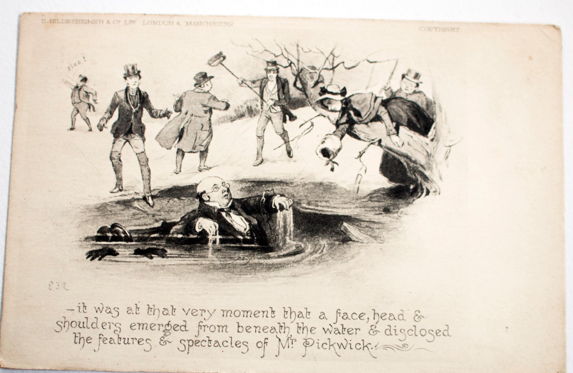An S. Hildesheimer & Co. Ltd. Charles Dickens postcard featuring a scene with Mr. Pickwick'. In good condition, corners rubbed, surface marks. Used, postmarked 1905.