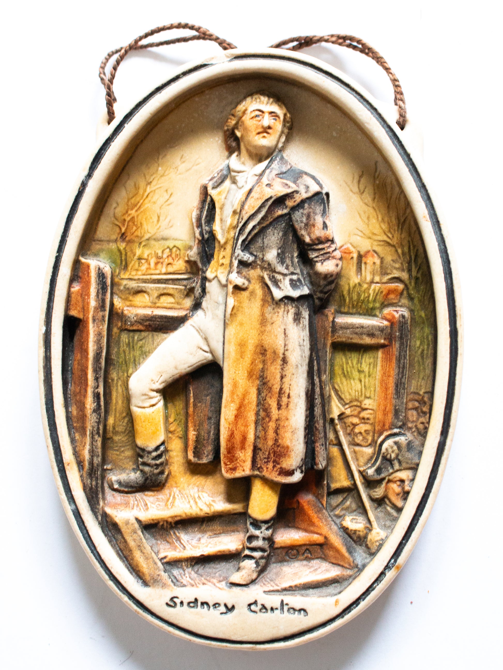 An Osborne Ivorex wall plaque featuring the Charles Dickens character 'Sidney Carlton'. In good condition, some wear to colours. 'Ivorex' stamp to rear, 1910 copyright 'A. Osborne' embossed to bottom edge. Approx. 12.5 x 9 cm with a depth of approx. 1.3 cm. Hung with brown string.