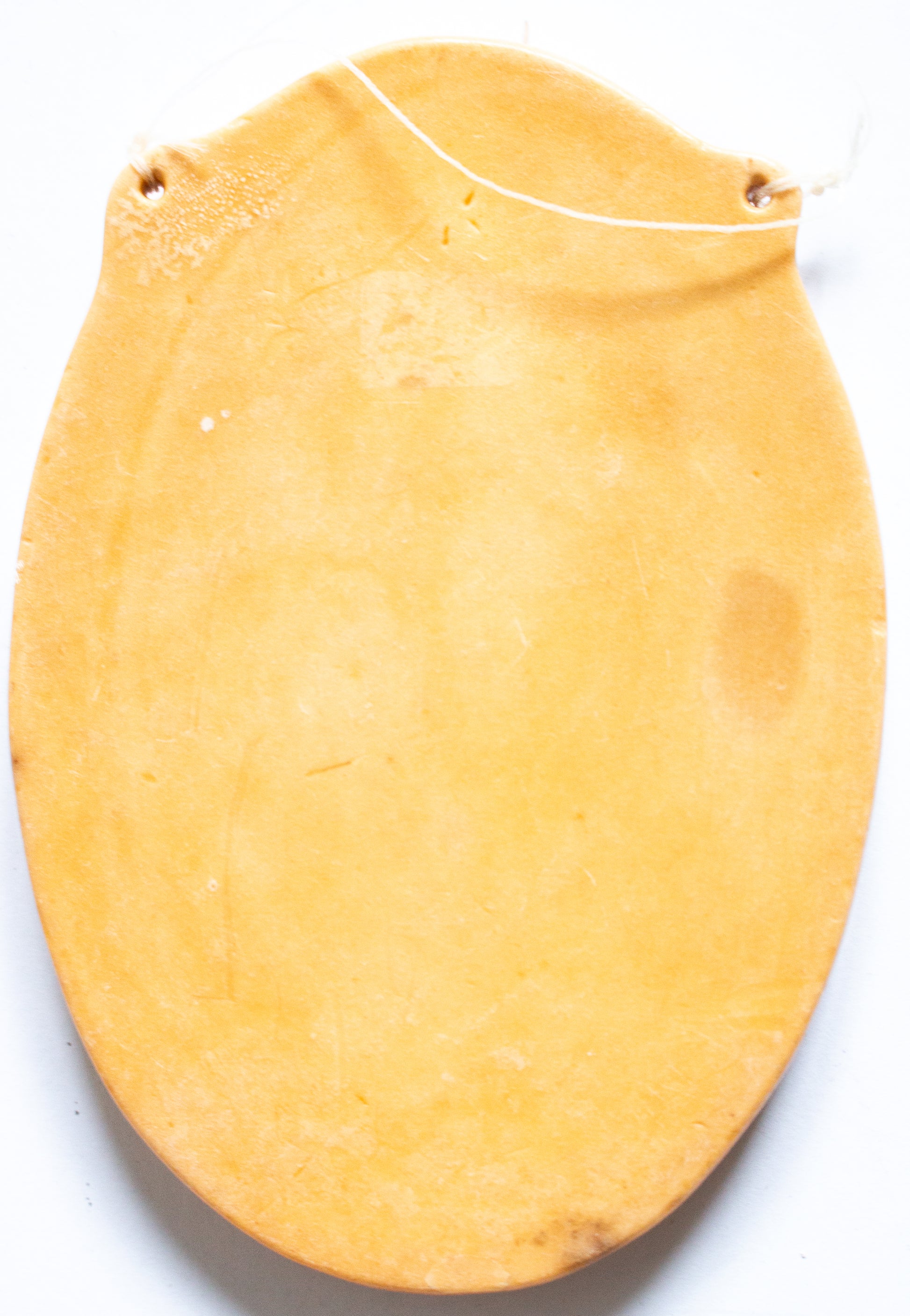 An Osborne Ivorex wall plaque featuring the Charles Dickens character 'Dick Swiveller'. In fair to good condition, possible wear to colours, chip to right hand side, nibbles to bottom edge. 'Ivorex' stamp to rear, 1910 copyright 'A. Osborne' embossed to bottom edge. Approx. 12.5 x 9 cm with a depth of approx. 1.3 cm. Hung with brown string.