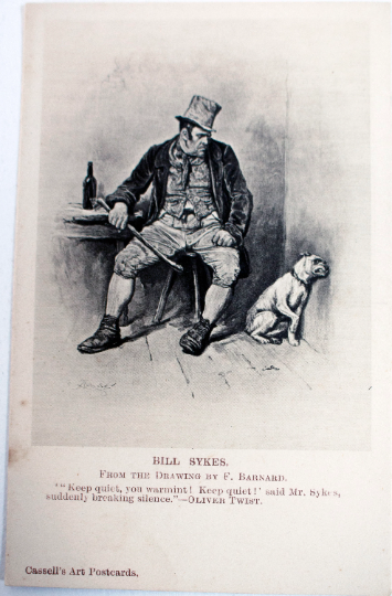 A Cassell's 'Art Cards' black and white postcard 'Bill Sikes', c. 1900, after English illustrator Frederick Barnard (1846 – 1896). In very good condition, occasional surface mark. Unused. Two available.