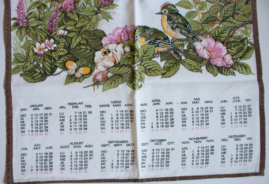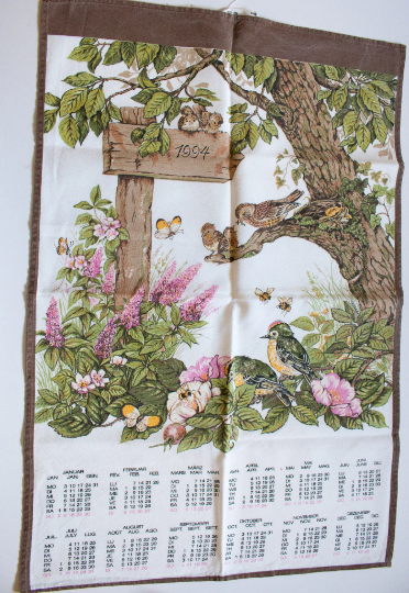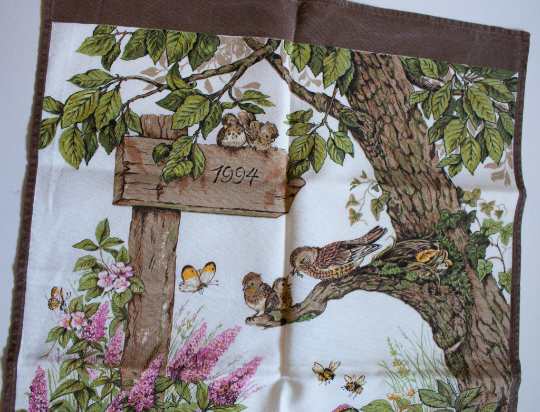A vintage 1994 calendar cotton viscose mix tea towel with print of nesting birds in a tree. In good condition, wear and fading from use. Approx. 43 x 65 cm. Perfect for framing or to add to a collection.