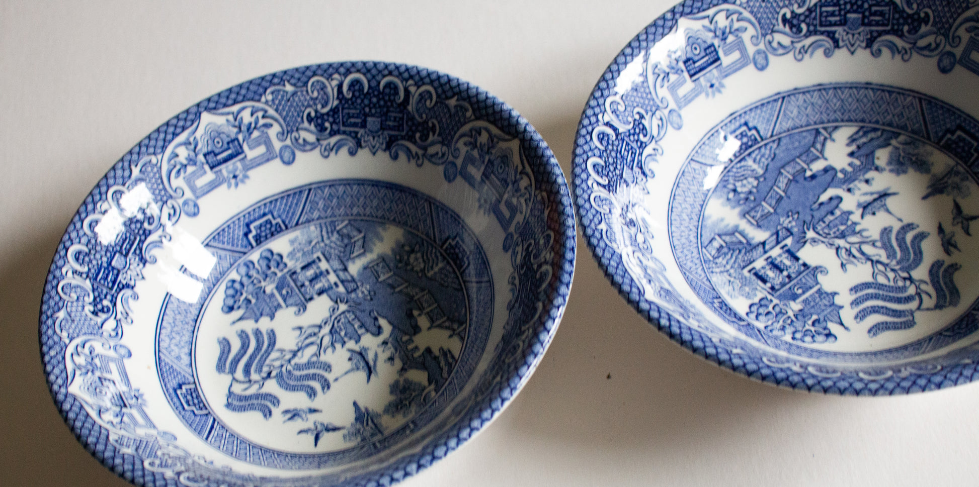English Ironstone Tableware 'Willow' Pattern Blue and White Transferware Cereal or Dessert Bowls (2)