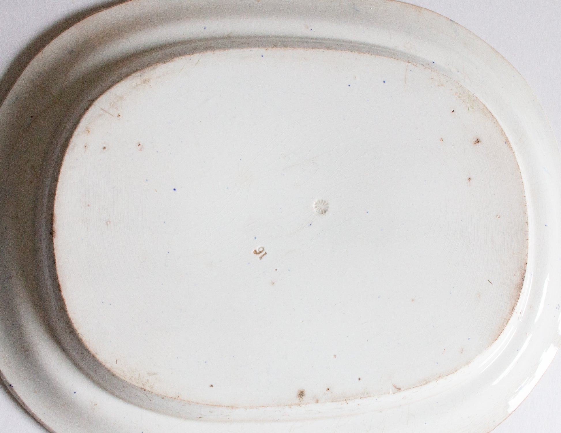 A large antique blue and white meat platter or serving dish, with fisherman and rose border. In good condition, crazing and staining evident, edges rubbed, hairline to back (please refer to photographs). Approx. 44 x 35 cm. Interested overseas buyers please enquire re: shipping options in the first instance as item weighs in excess of 2 kg with packaging.