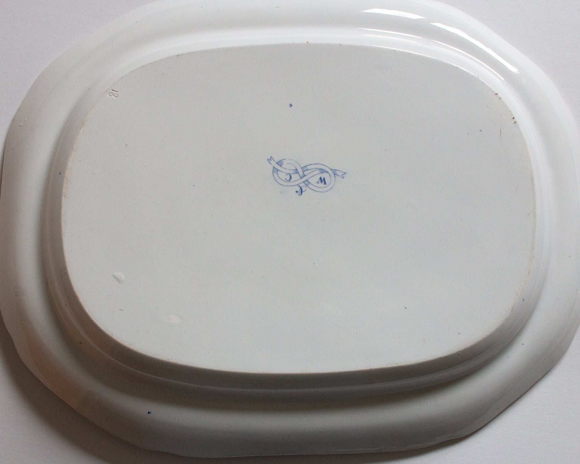 A large late nineteenth century 'Italian Ruins' type pattern blue and white transferware platter, very similar to Spode's 'Blue Italian' pattern. In good condition, some use evident. Approx. 48 x 37 cm, stamped to base with initials 'W. & C.' Interested overseas buyers please enquire re: shipping option in the first instance as item weighs in excess of 2 kg.