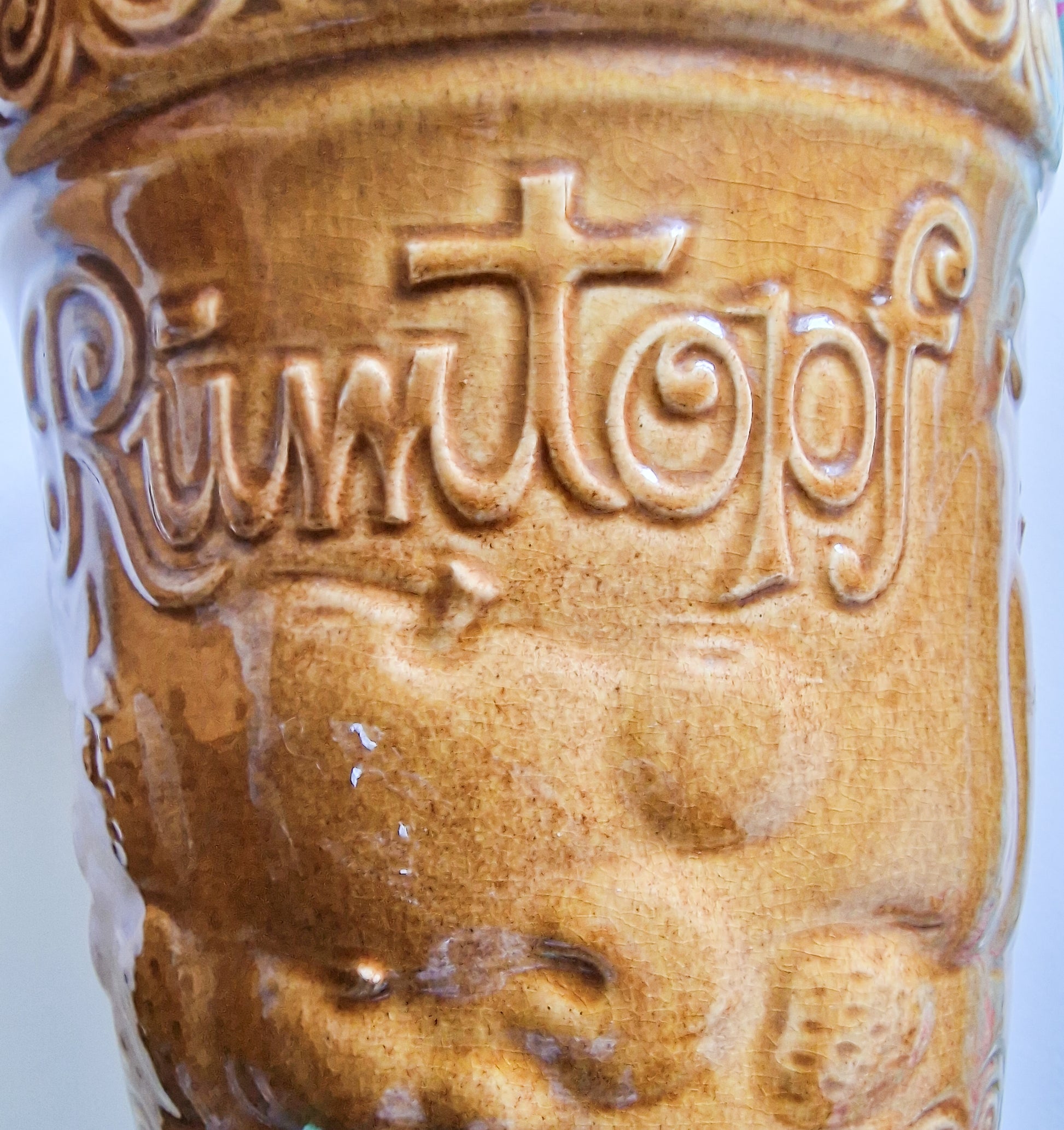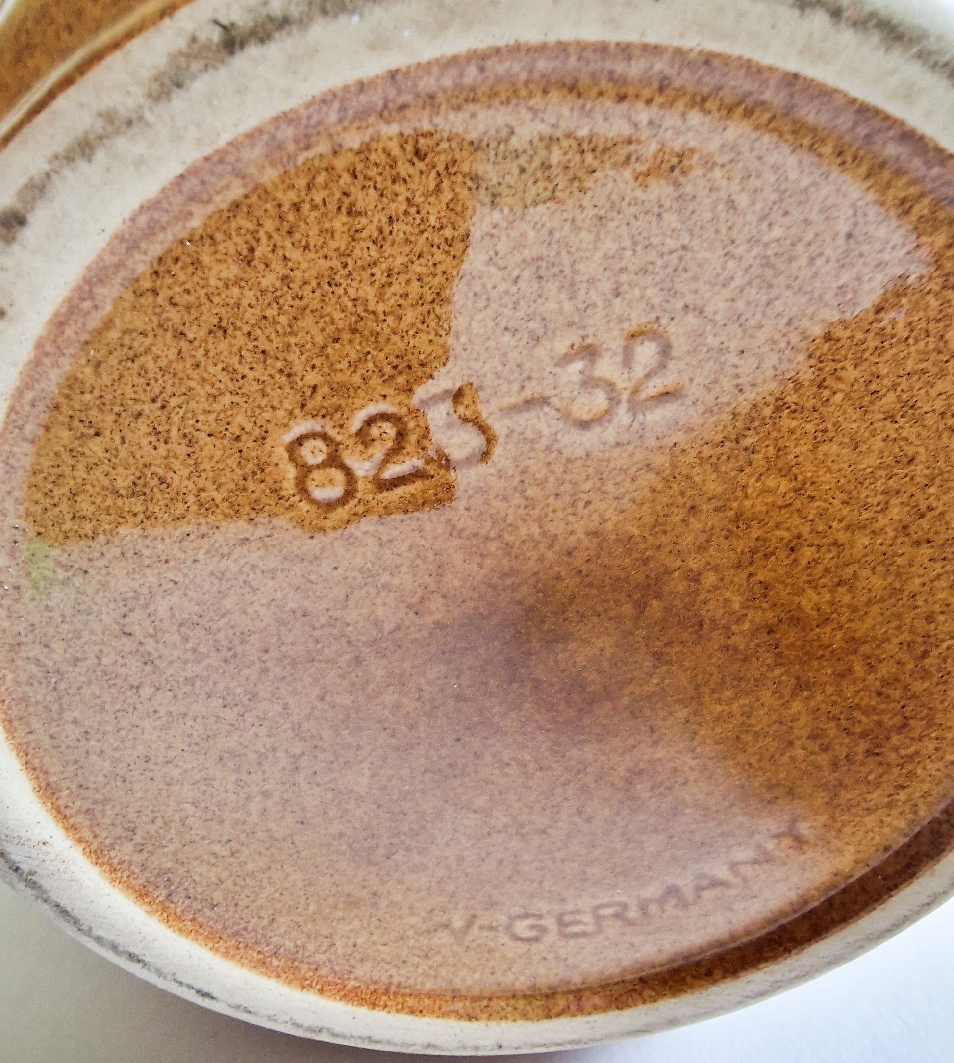 A large glazed earthernware West German 'Rumtopf' lidded jar, c. 1950s. In good condition, some light wear and crazing. Approx. 26 cm tall with a diameter of 22 cm. Impressed to base with 'W. Germany' and the number 823-32. Interested overseas buyers please enquire re: shipping options in the first instance, as item weighs in excess of 2 kg.