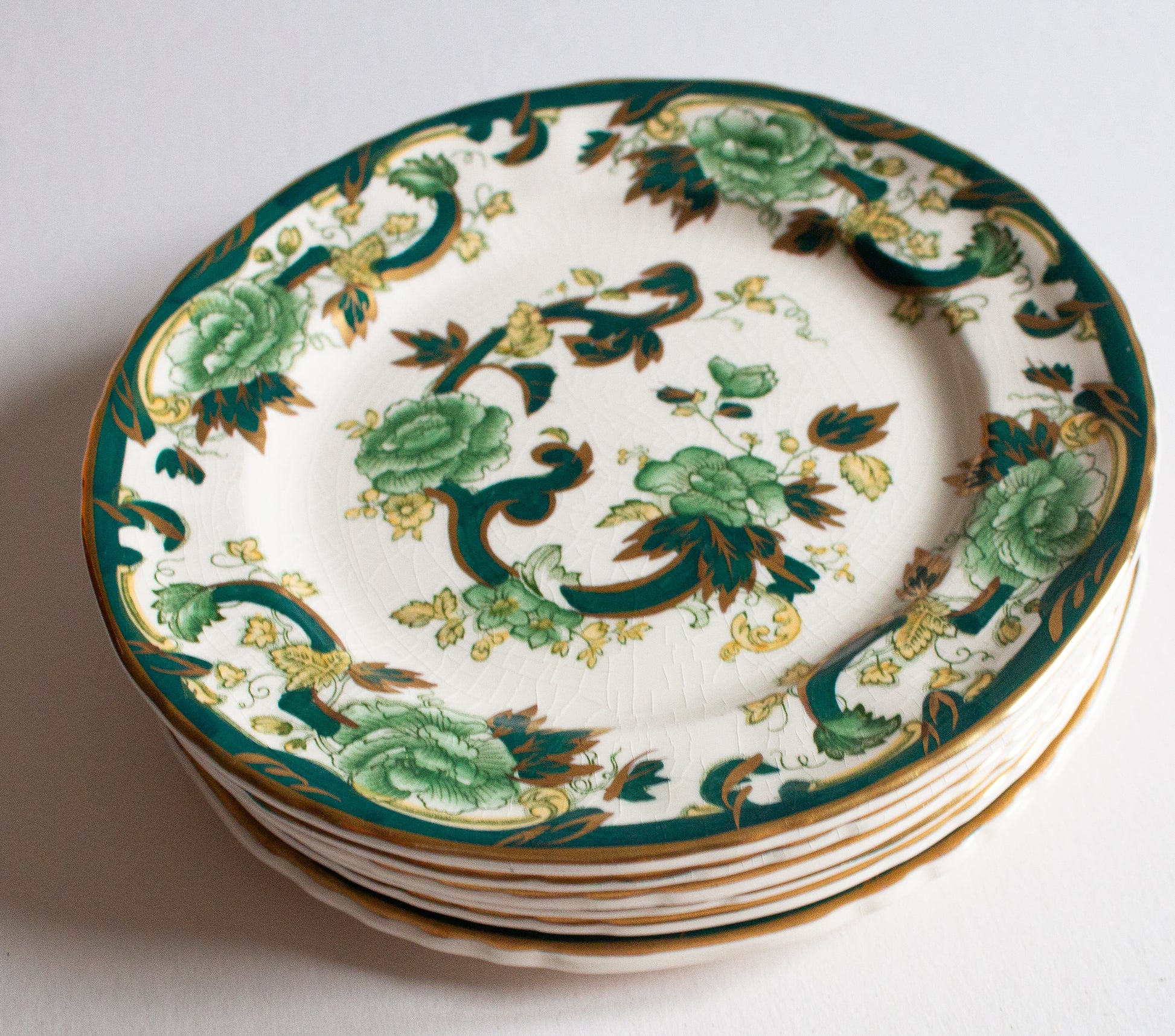 A set of six vintage Mason's Ironstone 'Chartreuse' pattern side plates. In good condition, some of the plates have crazing. Approx. 17 cm across. Interested overseas buyers please enquire re: shipping options in the first instance as item weighs in excess of 2 kg.