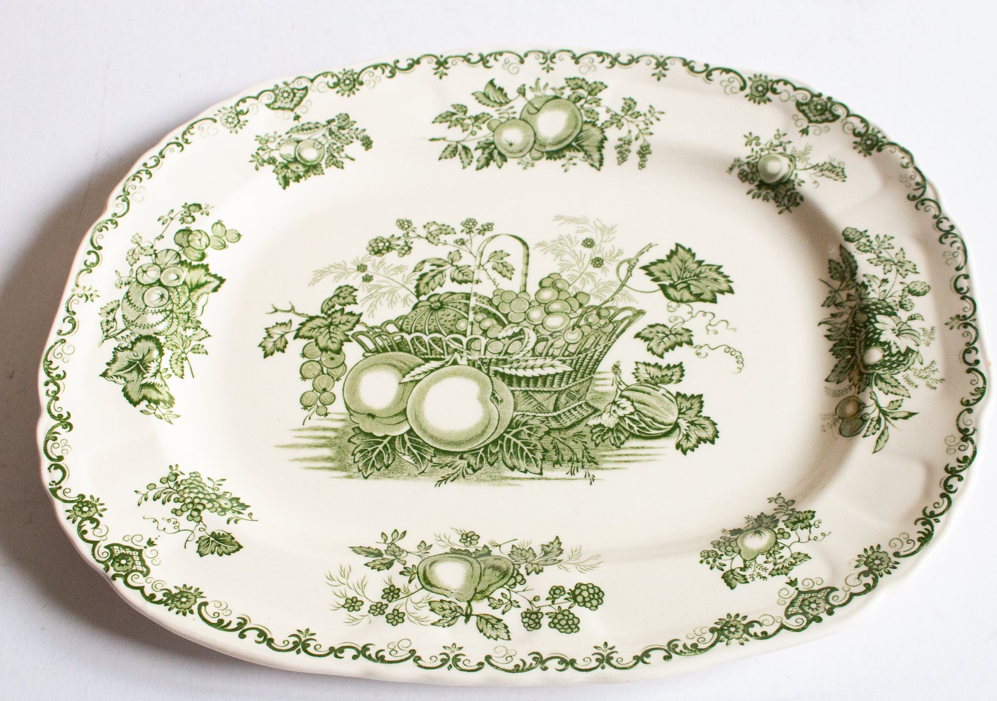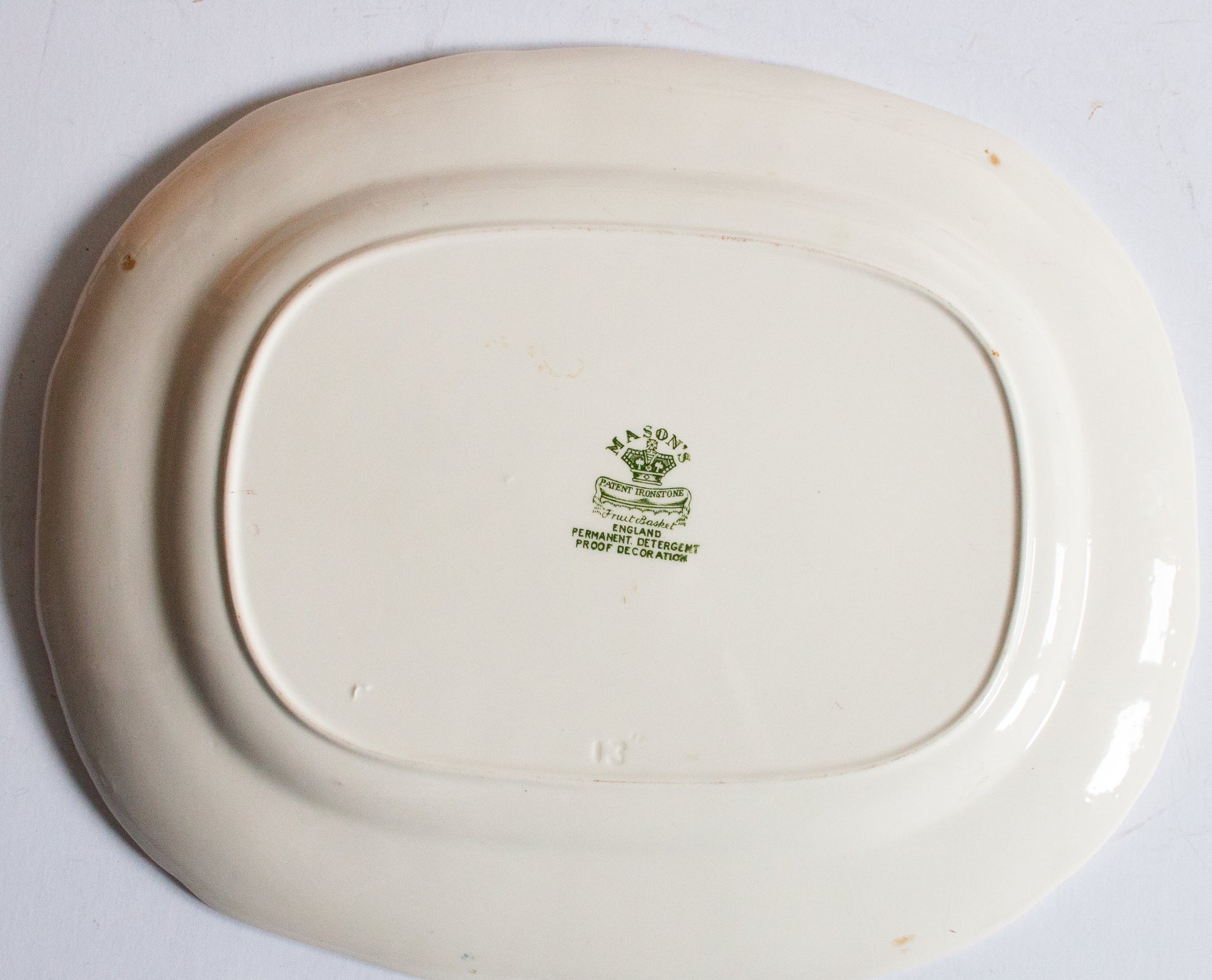 A Masons Ironstone 'Fruit Basket' pattern green and white transferware serving platter. In very good condition, some light wear. Approx. 34 x 27 cm. Interested overseas buyers please enquire re: shipping options in the first instance as item weighs in excess of 2 kg with packaging.