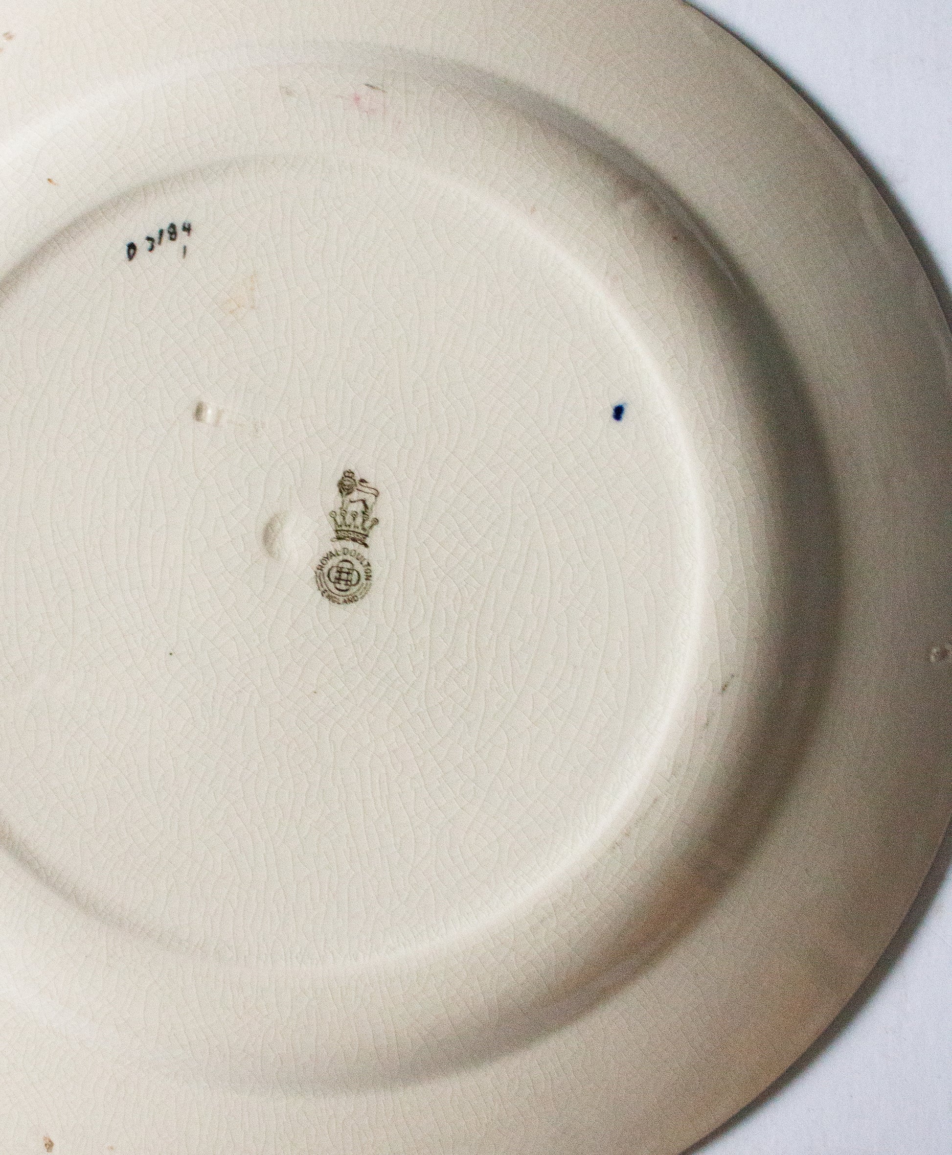 A Royal Doulton 'The Doctor' pattern brown and white transferware plate. In fair to good condition, crazing evident, kiln marks to front. Approx. 27 cm in diameter.