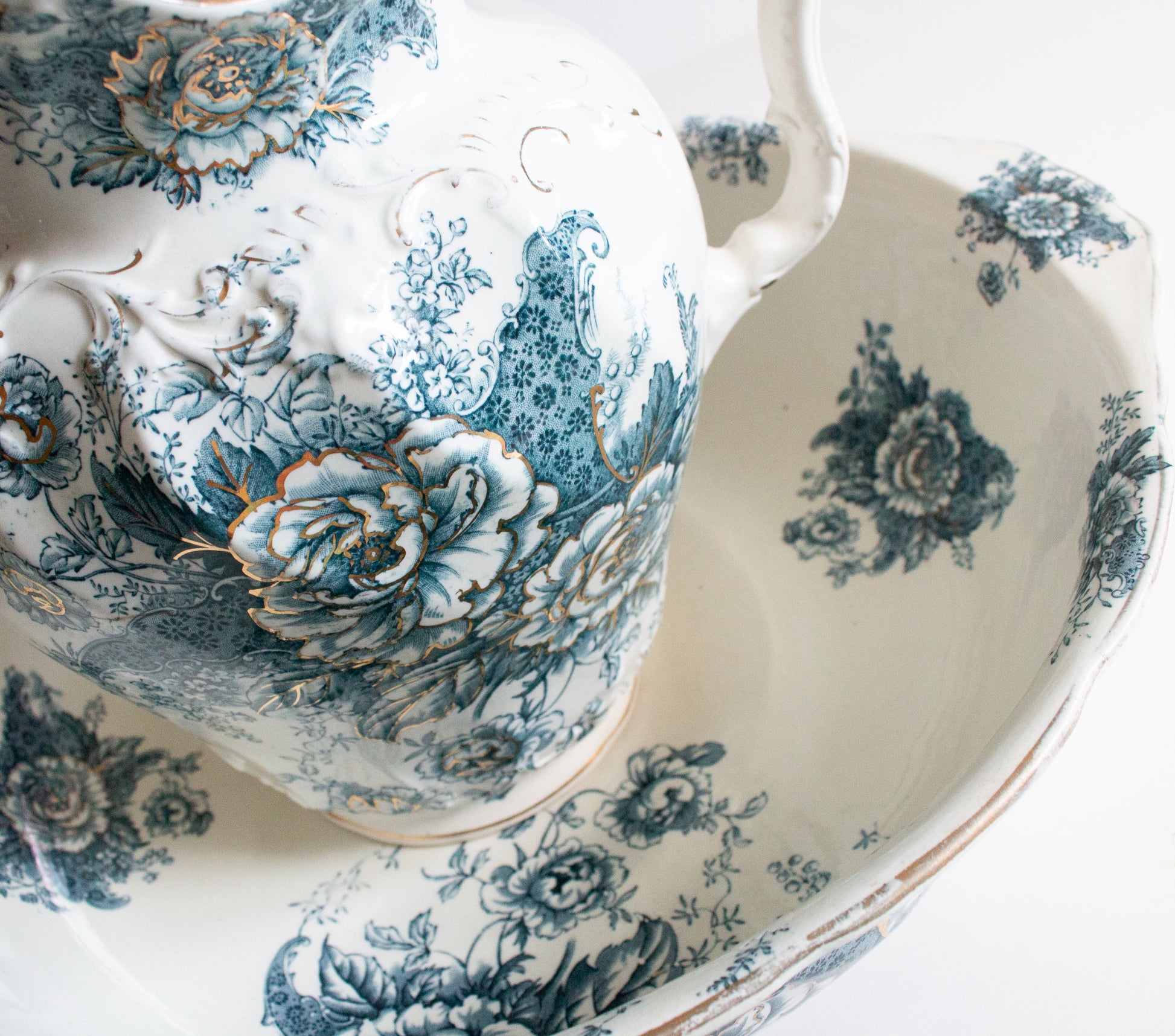 Stoke Pottery 'Peony' Antique Blue and White Transferware Wash Jug and Bowl