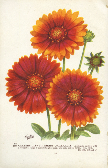 A vintage botanical print 'Carters Giant Hybrids Gaillardia' taken from Carter's 1934 garden catalogue 'The Blue Book of Gardening'. In very good condition, occasional surface mark and creasing, approx. 24 x 15 cm. Shipped in protective sleeve and card backed envelope ready for framing or to add to a collection.