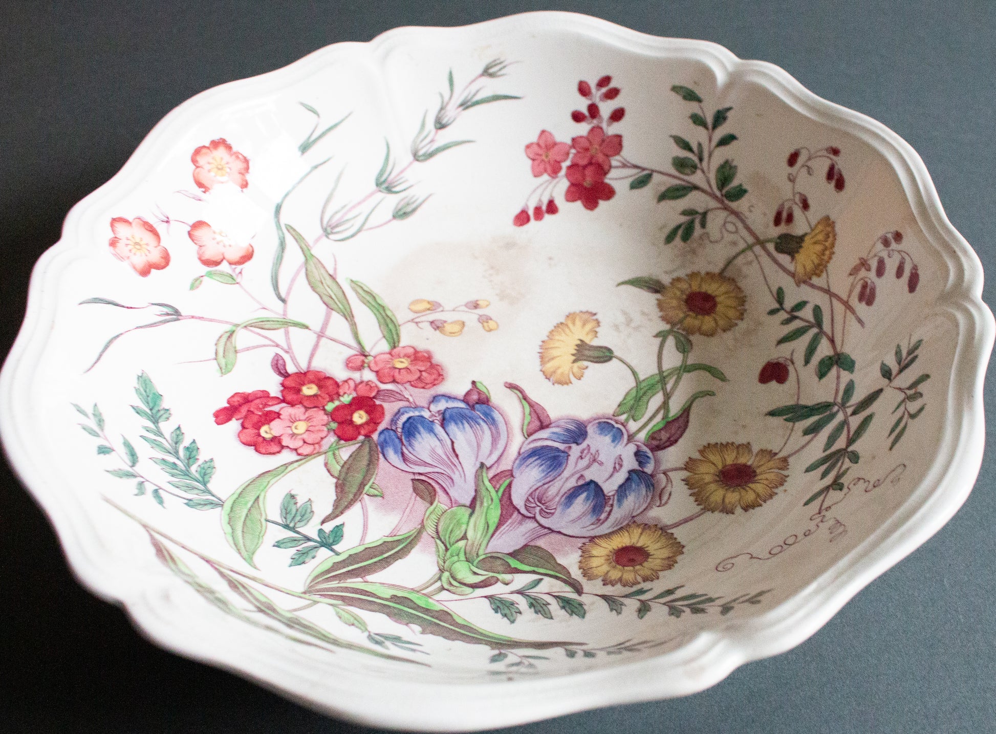A Wedgwood Etruria England hand painted floral serving bowl. In fair to good condition, staining and crazing evident. Approx. 26 cm diameter and 6 cm deep.